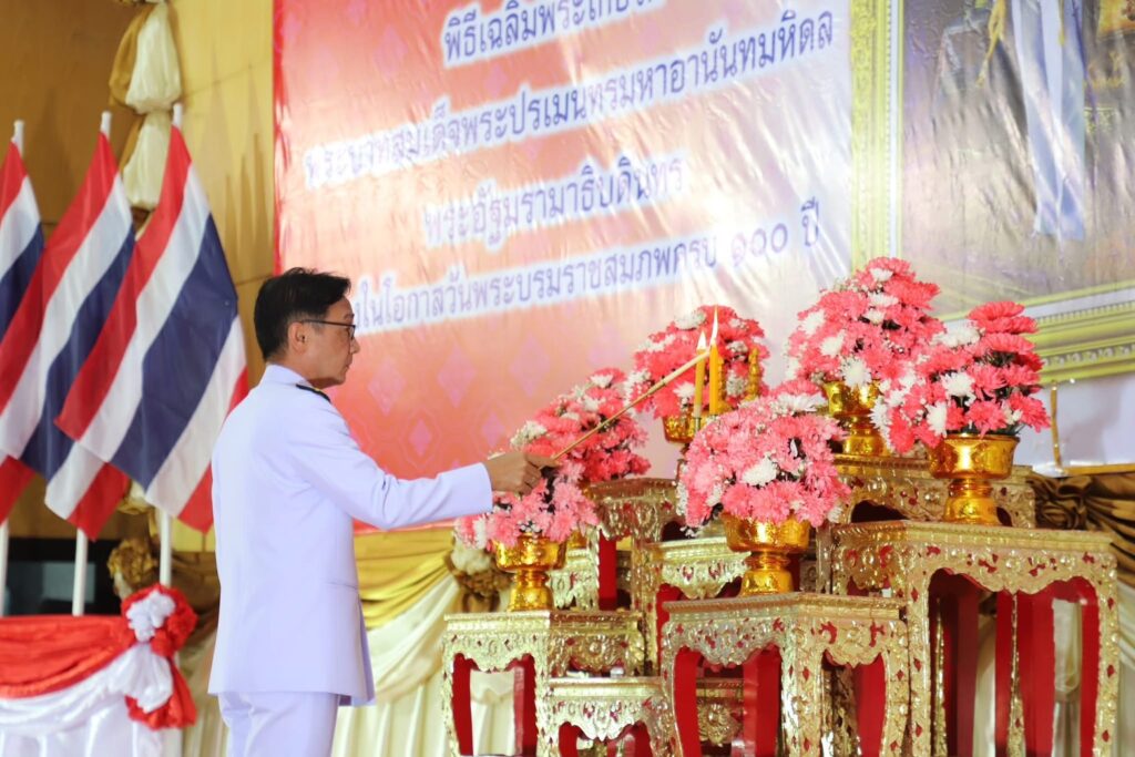 ร่วมพิธีเจริญพระพุทธมนต์ ทำบุญตักบาตร และวางพุ่มดอกไม้ถวายราชสักการะ เนื่องในโอกาสวันพระบรมราชสมภพครบ 100 ปี พระบาทสมเด็จพระปรเมนทรมหาอานันทมหิดล พระอัฐมรามาธิบดินทร